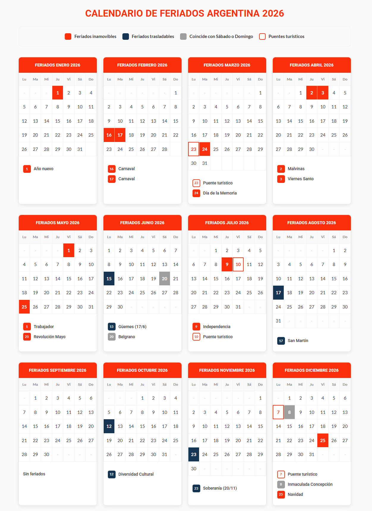 12 feriados inamovibles: Aquellos que se celebran el día exacto en que caen (como Año Nuevo, Navidad o el 25 de Mayo).